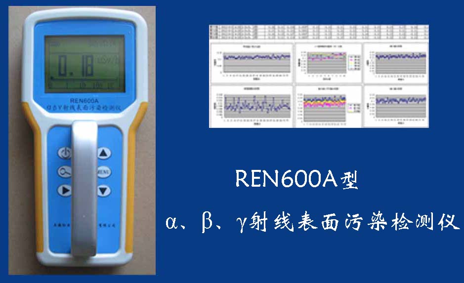 REN600A 表面沾污檢測儀REN600A型α、β、γ射線表面污染檢測儀即可檢測α、β、γ射線,也能檢測到X射線,它采用高速嵌入式微處器作為數據處理單元,點陣式大屏幕LCD液晶顯示,讀數清晰、操作方便,具有400條超大容量數據存儲。儀器采用進口的大面積MICA蓋革探測器,具有較高探測效率,可進行α、β輻射表面污染檢測和X、γ輻射劑量率的監(jiān)測。此外通過配套的RenriCont表面污染管理軟件可將存儲的數據讀出后分析。可廣泛用在制藥廠、實驗室、發(fā)電廠、進出口商檢、采石場、環(huán)境實驗室、環(huán)境污染調查、核安全應急、緊急狀況營救站、金屬處理廠、地下油田、供油管道裝備、醫(yī)院核醫(yī)學科、同位素實驗室、環(huán)境保護和警察局等部門。REN600A型α、β、γ射線表面